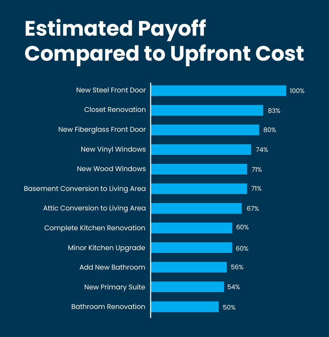 Topping the list? A new steel front door — offering an estimated 100% return on cost. Closet renovations, window replacements, and converting unused spaces like basements or attics into living areas also rank high on the list.